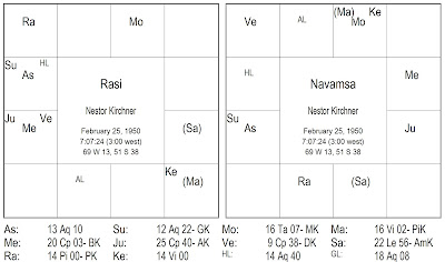 El 10 de Septiembre último, mientras transcurre el Antardasa de Rahu, dentro del Dasa de Saturno, este último transitaba a menos de seis grados de Marte y a menos de cuatro grados de Ketu (nodo sur), y le recordaba a Néstor Kirchner su condición de mortal, prefigurando una posible experiencia de conclusión cercana o a mediano plazo, cuando el mismo dirigido a razón de un signo por año de vida retorne a la casa siete, aspectando al Ascendente y al Sol, para sus 61 año en el 2011.
